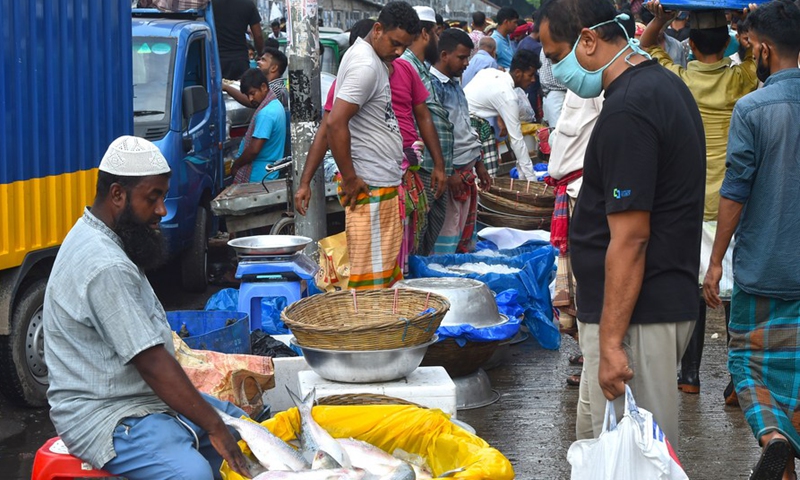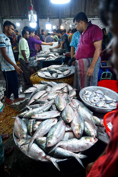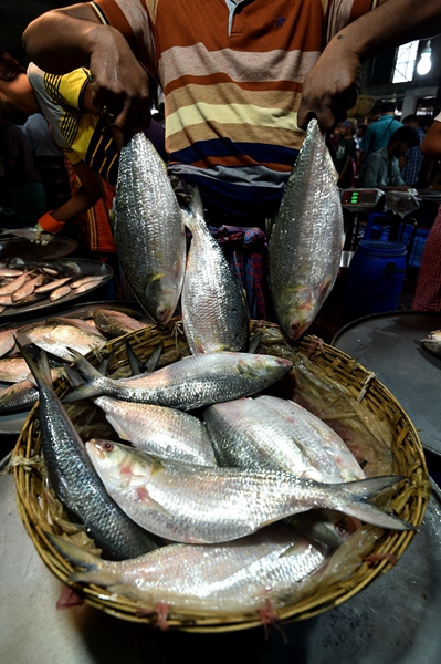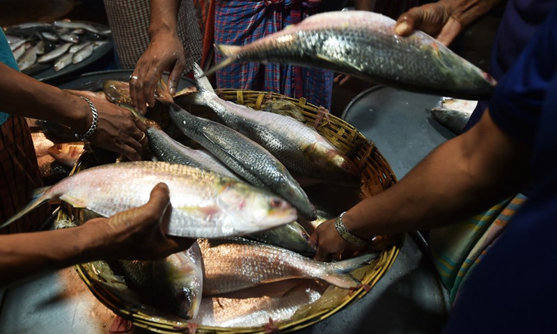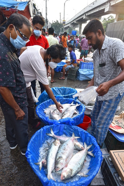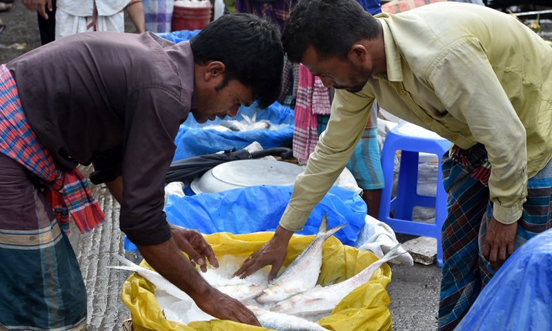 Vendors sell hilsa fish at a market in Dhaka, Bangladesh, Sept. 20, 2020. (Xinhua)
