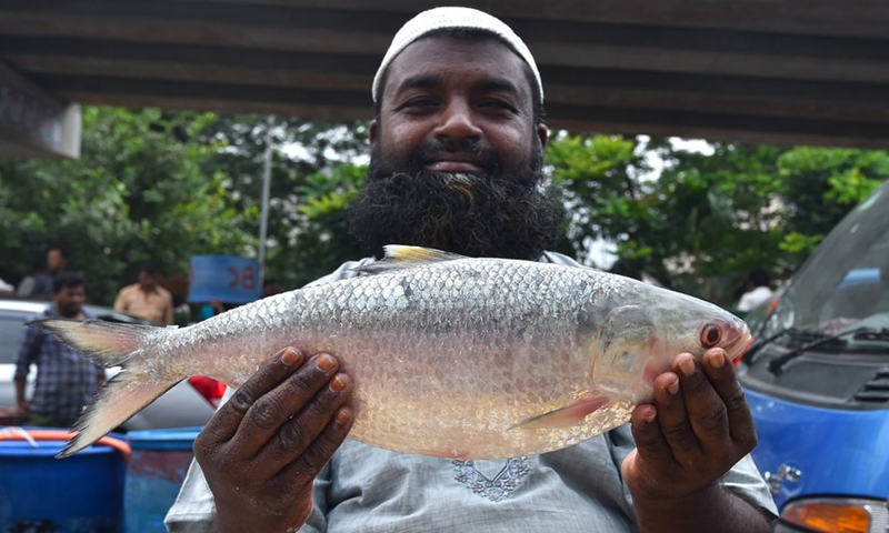 A vendor displays a hilsa fish at a market in Dhaka, Bangladesh, Sept. 20, 2020. (Xinhua)