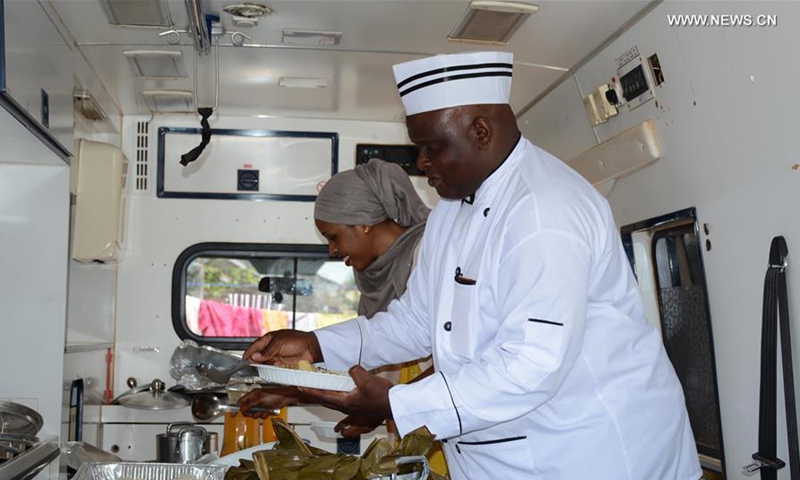 Uganda volunteer chef Muhamad Ddamba (front) prepares free meals for isolated COVID-19 patients inside a food van in Kampala, Uganda, Sept. 20, 2020. Ugandan volunteer chef Ddamba Muhamad supported by family members and friends arranges cooking and delivers free meals to health centers and hospitals where COVID-19 patients are quarantined. (Photo by Nicholas Kajoba/Xinhua)