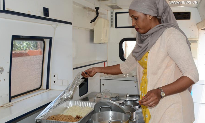A woman prepares free meals for isolated COVID-19 patients inside a food van in Kampala, Uganda, Sept. 20, 2020. Ugandan volunteer chef Ddamba Muhamad supported by family members and friends arranges cooking and delivers free meals to health centers and hospitals where COVID-19 patients are quarantined. (Photo by Nicholas Kajoba/Xinhua)