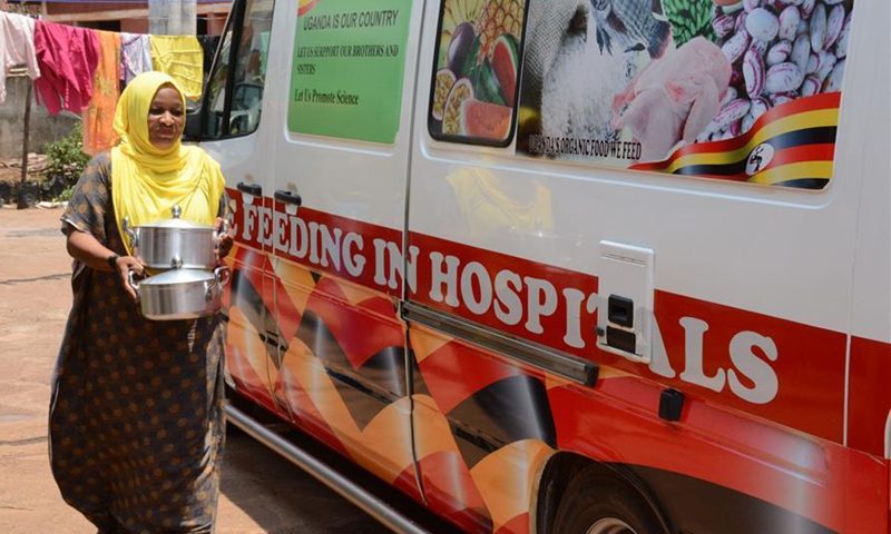 A woman delivers free meals for isolated COVID-19 patients in Kampala, Uganda, Sept. 20, 2020. Ugandan volunteer chef Ddamba Muhamad supported by family members and friends arranges cooking and delivers free meals to health centers and hospitals where COVID-19 patients are quarantined. (Photo by Nicholas Kajoba/Xinhua)
