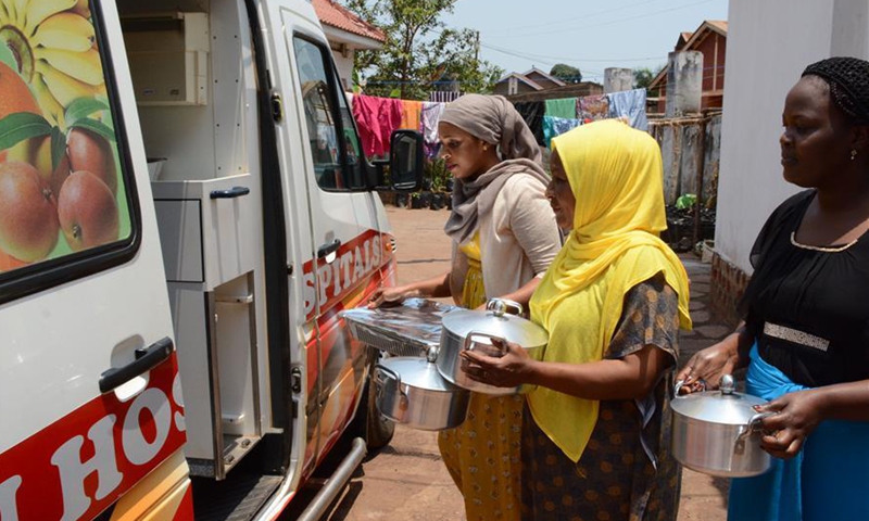 Women deliver free meals for isolated COVID-19 patients in Kampala, Uganda, Sept. 20, 2020. Ugandan volunteer chef Ddamba Muhamad supported by family members and friends arranges cooking and delivers free meals to health centers and hospitals where COVID-19 patients are quarantined. (Photo by Nicholas Kajoba/Xinhua)