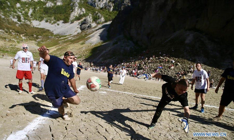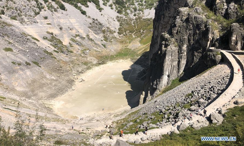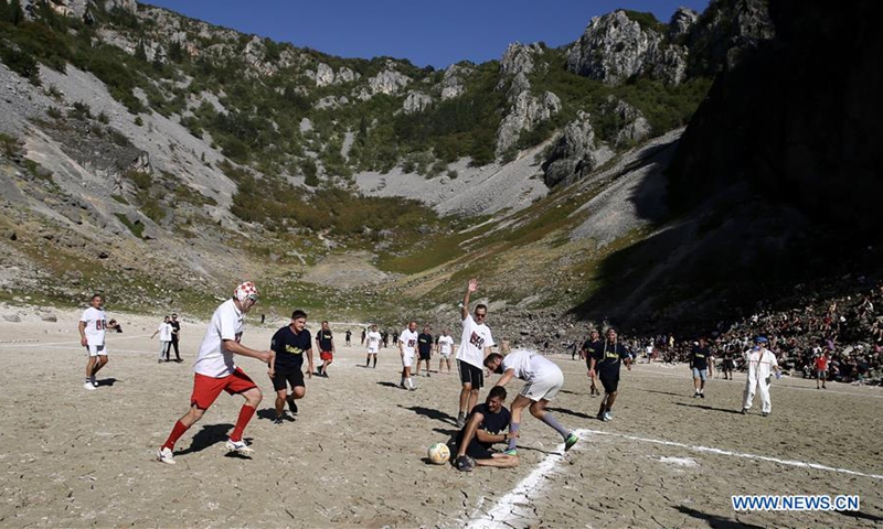 People play football on the dried bottom of the Blue Lake near Imotski, Croatia, Sept. 20, 2020. Lying in a deep sinkhole, the water level of the karst lake in southern Croatia varies with seasons. (Ivo Cagalj/Pixsell via Xinhua)