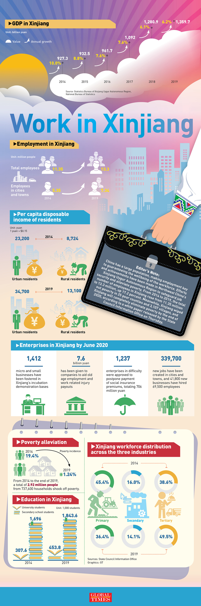 Editor's Note: China has a large population, making employment key to guaranteeing the wellbeing of the workforce. Efforts and achievements have been made in Northwest China's Xinjiang Uygur Autonomous Region to safeguard job security and alleviate poverty. From 2014 to 2019, the total number of employees in Xinjiang rose from 11.35 million to 13.3 million, up 17.2 percent. Meanwhile, Xinjiang wiped out poverty in 25 poor counties and 3,107 villages, and Xinjiang will completely eliminate poverty by the end of 2020, according to a white paper released by the State Council Information Office on Thursday.