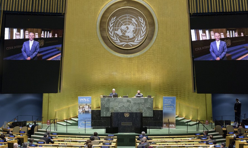 President of the International Court of Justice (ICJ) Abdulqawi Yusuf (on screen) addresses a high-level meeting to commemorate the 75th anniversary of the United Nations at the UN headquarters in New York, on Sept. 21, 2020. (Manuel Elias/UN Photo/Handout via Xinhua)