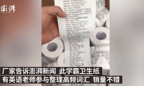 A manufacturer in Dongguan, South China's Guangdong Province, fills toilet paper with English words and says the product is specially designed for "straight-A students." Photo: Screenshot of a video posted by The Paper