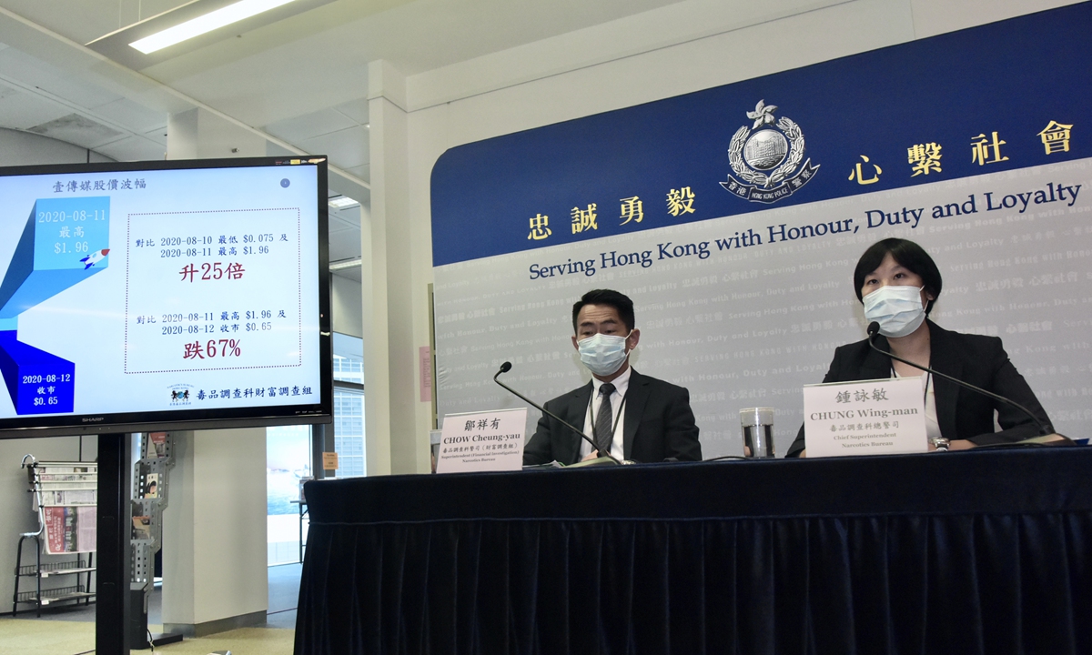 Hong Kong police attend a Thursday briefing about the arrest of 15 people in connection to the surge in shares of Next Digital. Photo: cnsphoto