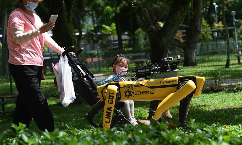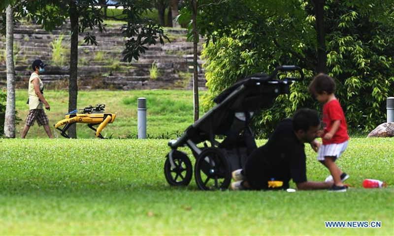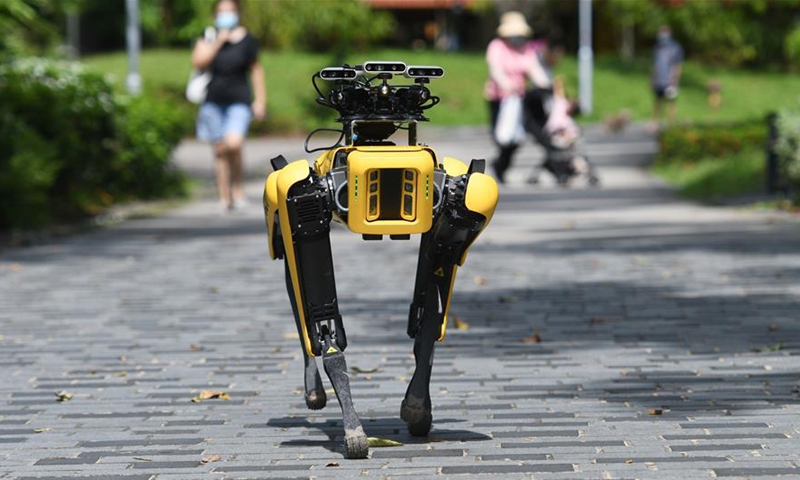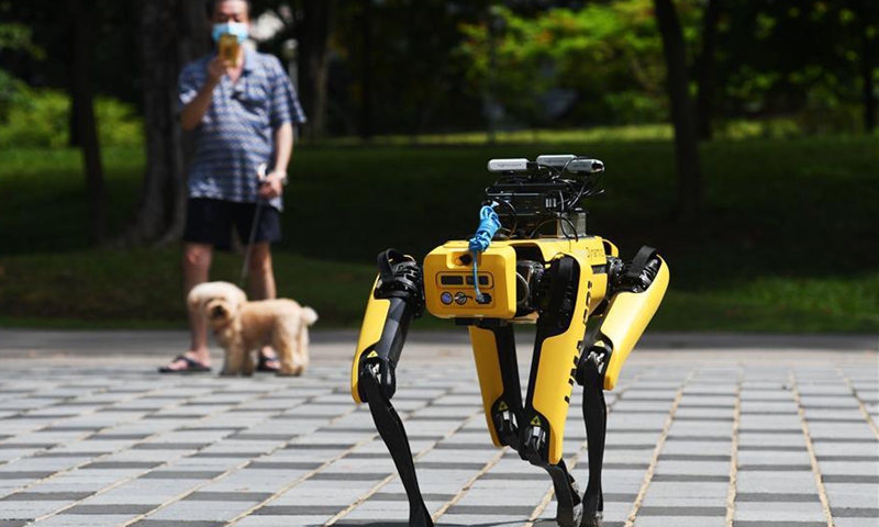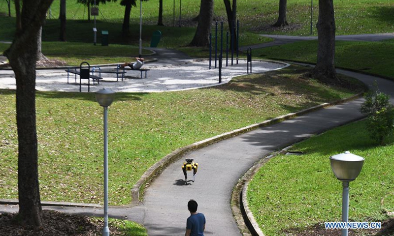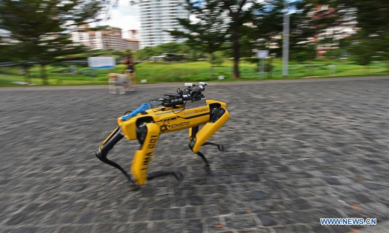 Robot dog SPOT which can detect whether visitors wear masks or not is seen during its second round trials in Singapore's Bishan Park, as part of measures against the spread of COVID-19, on Sept. 22, 2020. Besides maintaining safe social distancing, SPOT has increased capabilities like mask detection and 3D mapping without lidar during the second round trials. (Photo by Then Chih Wey/Xinhua)