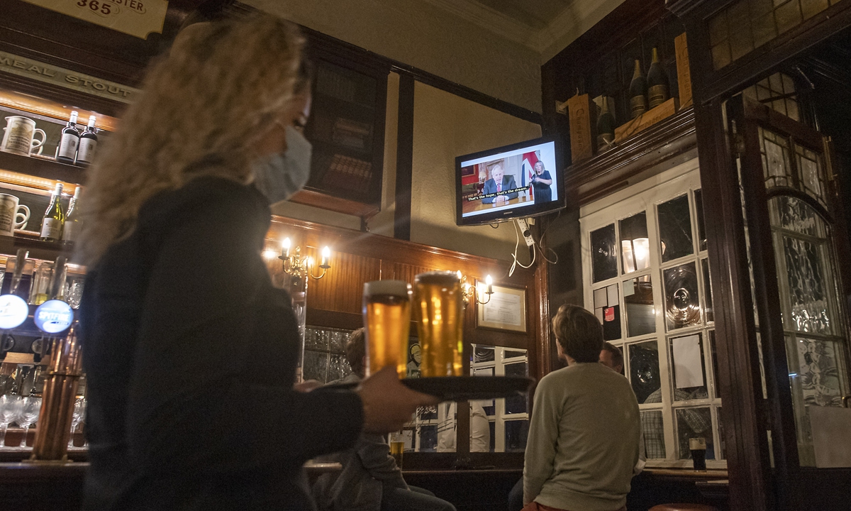 A waitress serves drinks as patrons watch Britain's Prime Minister Boris Johnson addressing the nation about the latest updates on the COVID-19 restrictions, at the Westminster Arms in London on Tuesday. Photo: AFP