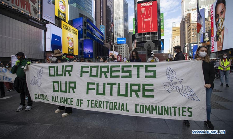 People take part in a climate change protest in Times Square in New York, the United States, on Sunday. Photo: Xinhua