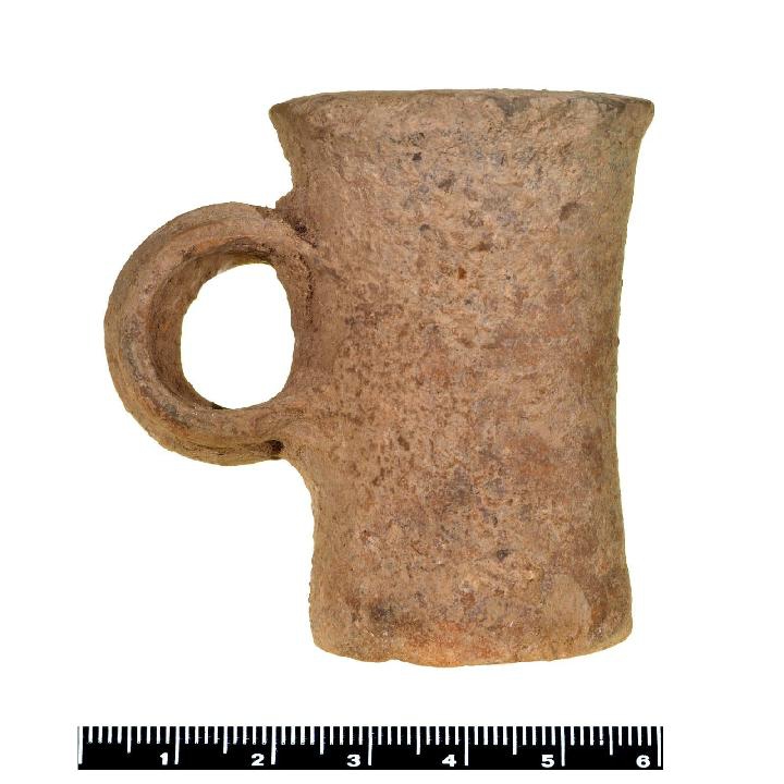 The inkwell was made of a flat-bottomed clay cylinder with a round handle and a narrow opening with an inward-sloping rim, through which the ink and pen were inserted.