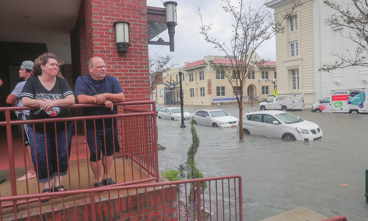Two Americans peer into a flooded street in front of their hotel as Hurricane Sally passed through the area on Wednesday local time in Pensacola, Florida. The storm is bringing heavy rain, high winds and a dangerous storm surge to the area. Photo: AFP