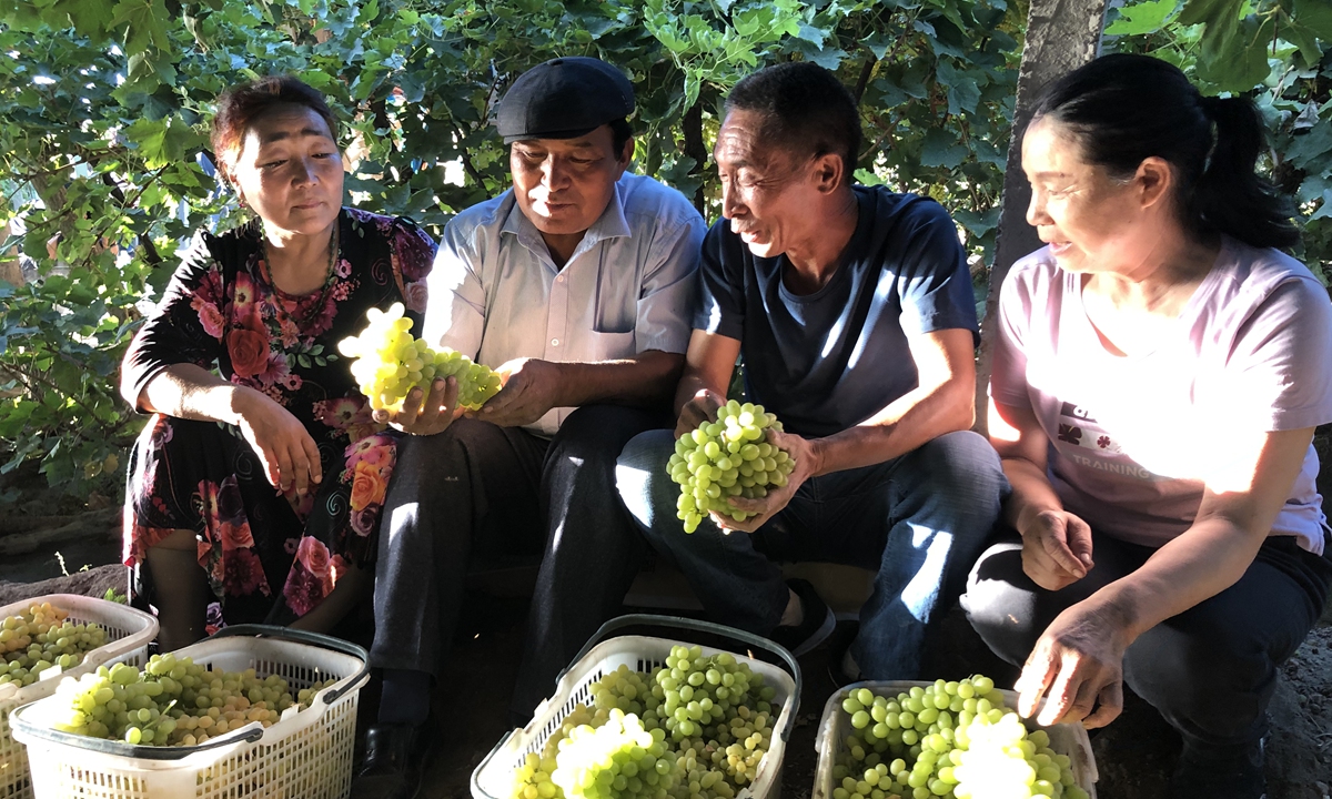 While busy cutting grapes and putting them into baskets, Zhang Xinbao and Memet Hanbdu chatted happily about this year's harvest. Other members of their two families were also working in the same vineyard, as it has become a ritual for them to help each other harvest and transfer grapes almost every year.