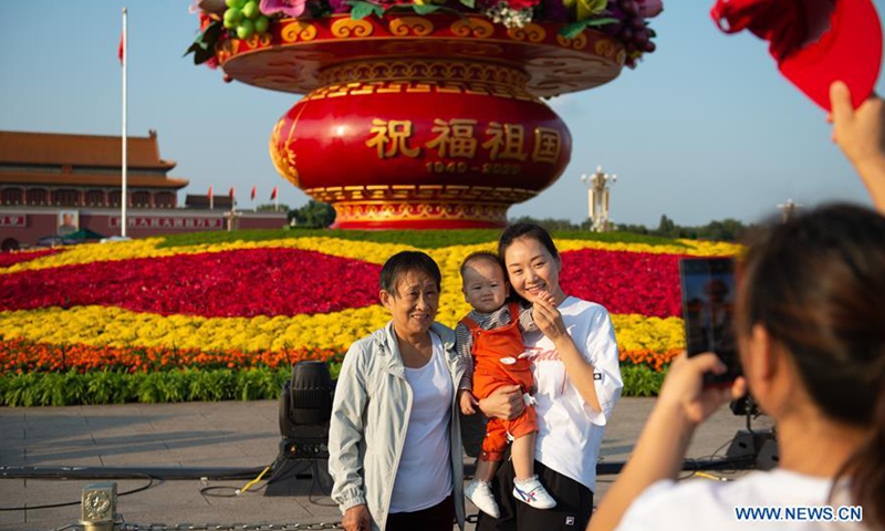 Tourists pose for photos in front of a "flower basket" at Tian'anmen Square in Beijing, capital of China, Sept. 24, 2020. The 18-meter-tall display in the shape of a flower basket is placed at the center of Tian'anmen Square as a decoration for the upcoming National Day holiday.Photo:Xinhua