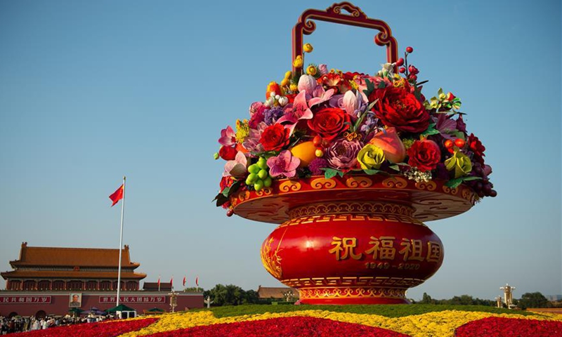 Photo taken on Sept. 24, 2020 shows a "flower basket" at Tian'anmen Square in Beijing, capital of China. The 18-meter-tall display in the shape of a flower basket is placed at the center of Tian'anmen Square as a decoration for the upcoming National Day holiday.Photo:Xinhua