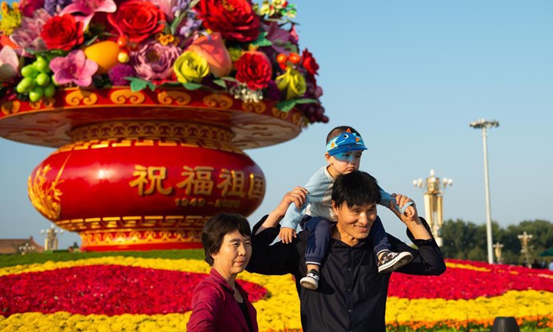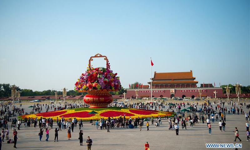 Tourists walk near a "flower basket" at Tian'anmen Square in Beijing, capital of China, Sept. 24, 2020. The 18-meter-tall display in the shape of a flower basket is placed at the center of Tian'anmen Square as a decoration for the upcoming National Day holiday. Photo:Xinhua