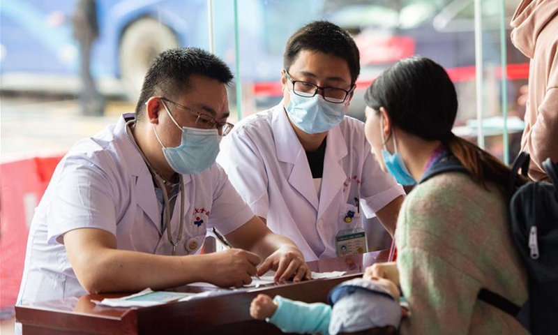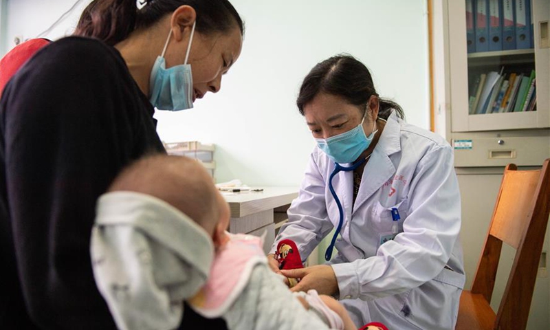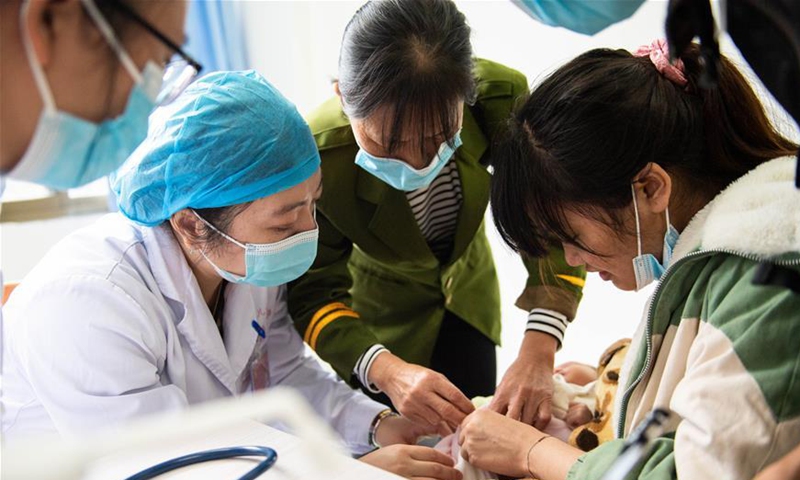 A doctor from Hunan Children's Hospital performs congenital heart disease (CHD) screening for a newborn baby in Loudi, central China's Hunan Province, Sept. 25, 2020. Hunan Province has piloted a CHD screening program at hospitals in its four cities, namely Changsha, Shaoyang, Yueyang and Loudi. Under the program, newborn babies diagnosed with CHD will be transferred to Hunan Children's Hospital for further evaluation and free treatment. (Xinhua/Chen Sihan)