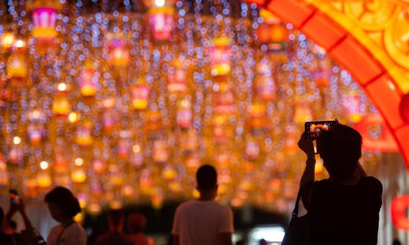 Citizens take photos of illuminations at the Largo Do Senado in Macao, south China, Sept. 25, 2020. Main streets, squares, gardens and buildings in Macao are decorated with illuminations to celebrate the upcoming Mid-Autumn Festival and the National Day holiday.Photo:Xinhua