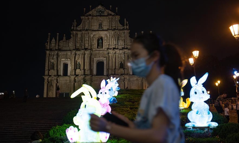 Illumination installations are seen in front of the Ruins of the St. Paul's in Macao, south China, Sept. 25, 2020. Main streets, squares, gardens and buildings in Macao are decorated with illuminations to celebrate the upcoming Mid-Autumn Festival and the National Day holiday.Photo:Xinhua