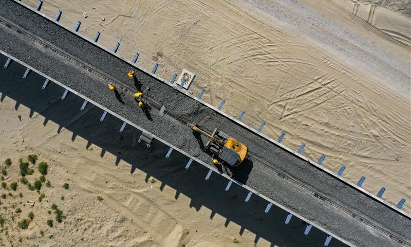 Aerial photo taken on Sept. 25, 2020 shows workers laying tracks at the construction site of Hotan-Ruoqiang railway in northwest China's Xinjiang Uygur Autonomous Region. With a total length of about 825 kilometers, the railway is an important part of the train loop of the Tarim Basin.Photo:Xinhua