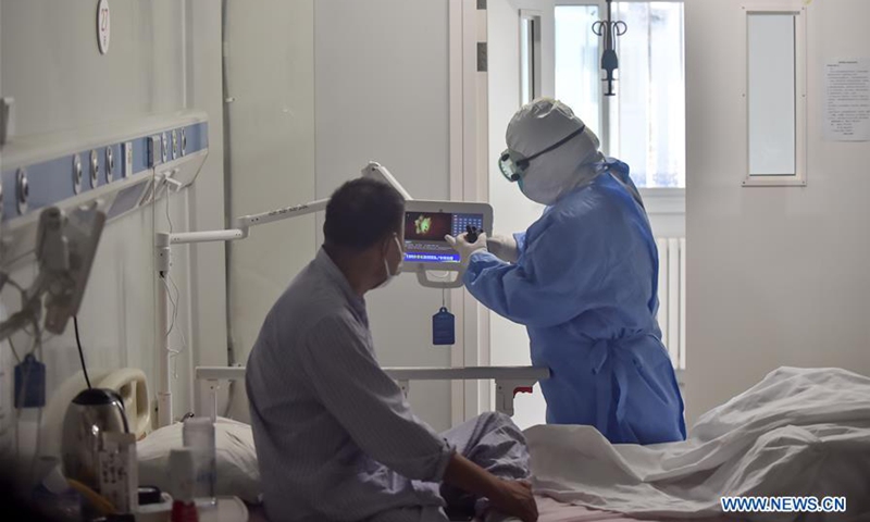A nurse adjusts a TV set for a COVID-19 patient at an isolation ward in Beijing Ditan Hospital in Beijing, capital of China, June 16, 2020. Chinese health authority said Tuesday that it received reports of 40 new confirmed COVID-19 cases on the Chinese mainland Monday, of which 32 were domestically transmitted and eight were imported. Of the domestically transmitted cases, 27 were reported in Beijing, four in Hebei Province, and one in Sichuan Province, the National Health Commission said in its daily report. Right now, all the COVID-19 patients reported in Beijing are receiving medical treatment in Beijing Ditan Hospital. (Photo: Xinhua)
