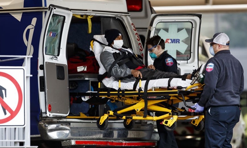 Medical workers carry a patient from an ambulance to George Washington University Hospital in Washington D.C., the United States, on April 27, 2020. Photo:Xinhua