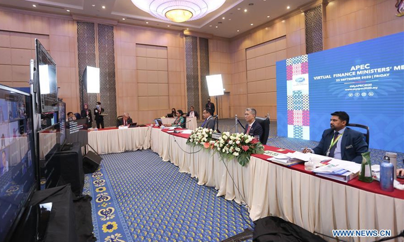 Malaysian Finance Minister Tengku Zafrul Tengku Abdul Aziz (2nd R) chairs a virtual meeting of finance ministers of Asia-Pacific Economic Cooperation (APEC) economies in Putrajaya, Malaysia, Sept. 25, 2020. Finance ministers of APEC economies met virtually Friday to share and exchange ideas on fiscal and monetary interventions to mitigate the economic impact of the COVID-19 pandemic, as well as to build a more resilient economy. (Malaysia's International Trade and Industry Ministry/Handout via Xinhua)
