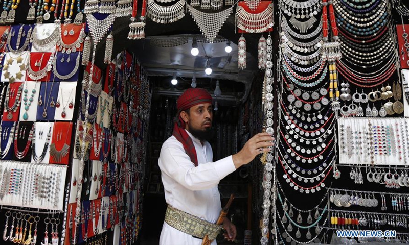 A vendor arranges accessories at a market in Old City of Sanaa, Yemen Sept. 26, 2020. (Photo by Mohammed Mohammed/Xinhua)