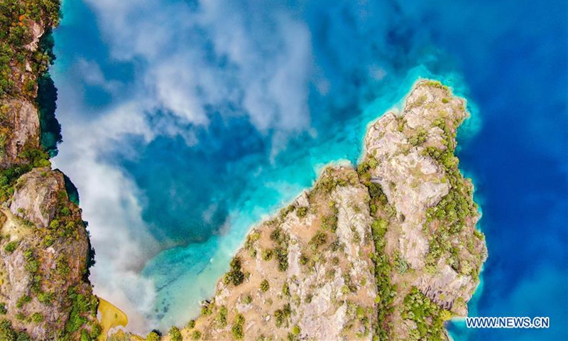 Photo taken with a drone shows the "white lake" of the "three-colored lakes" in Puyu Village of Banbar County, Qamdo, southwest China's Tibet Autonomous Region, Sept. 26, 2020. The "three-colored lakes" in Banbar County are comprised of three hill-seperated ponds which display black, white and yellow colors due to their varying depths and sediments. (Xinhua/Jigme Dorje)