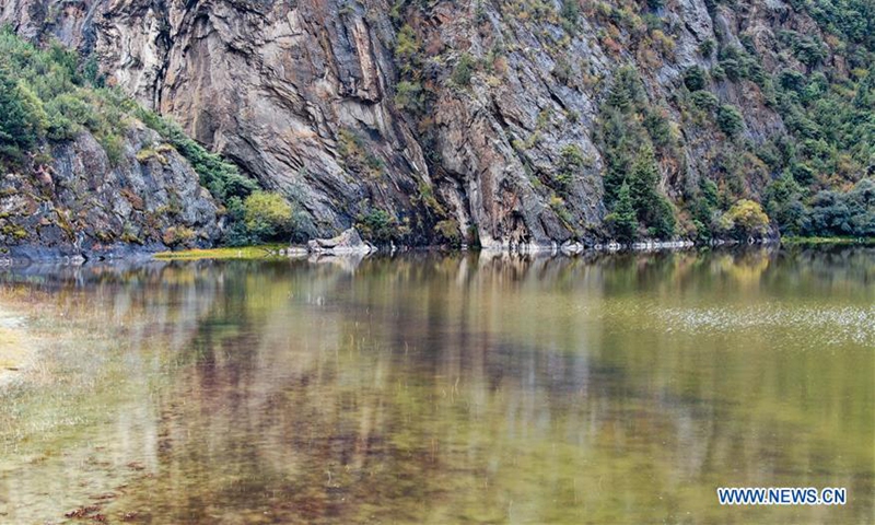 Photo taken with a drone shows the "black lake" of the "three-colored lakes" in Puyu Village of Banbar County, Qamdo, southwest China's Tibet Autonomous Region, Sept. 26, 2020. The "three-colored lakes" in Banbar County are comprised of three hill-seperated ponds which display black, white and yellow colors due to their varying depths and sediments. (Xinhua/Jigme Dorje)