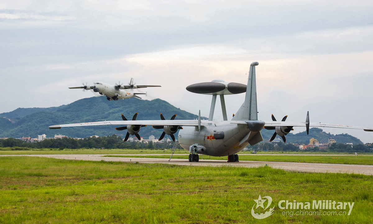 A KJ-500 airborne early warning (AEW) aircraft attached to a naval aviation regiment under the PLA Southern Theater Command taxies on the runway before takeoff during a round-the-clock flight training exercise on August 19, 2020.Photo:China Military