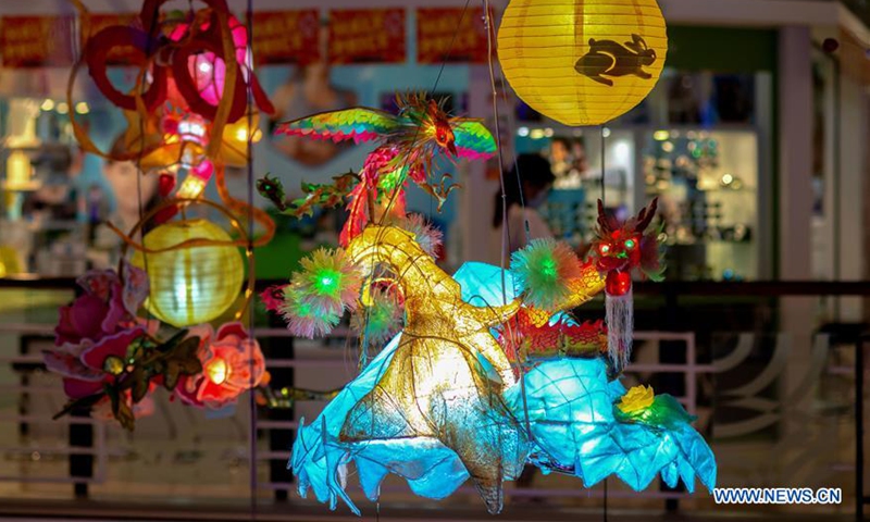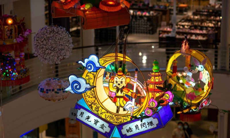 Various lanterns are seen during a lantern-making contest to celebrate the upcoming Mid-Autumn Festival at a shopping mall in Kuala Lumpur, Malaysia, Sept. 27, 2020. (Photo by Chong Voon Chung/Xinhua)