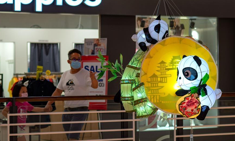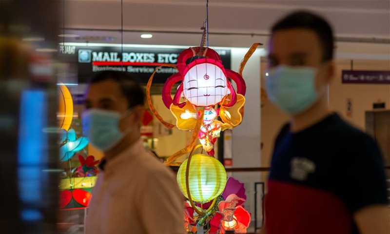 People walk near the lantern works during a lantern-making contest to celebrate the upcoming Mid-Autumn Festival at a shopping mall in Kuala Lumpur, Malaysia, Sept. 27, 2020. (Photo by Chong Voon Chung/Xinhua)