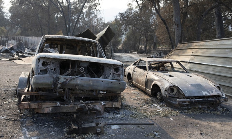 Photo taken on Aug. 28, 2020 shows the wreckage at the site where a wildfire swept through in Vacaville of Solano County, Northern California, the United States. (Photo by Li Jianguo/Xinhua)