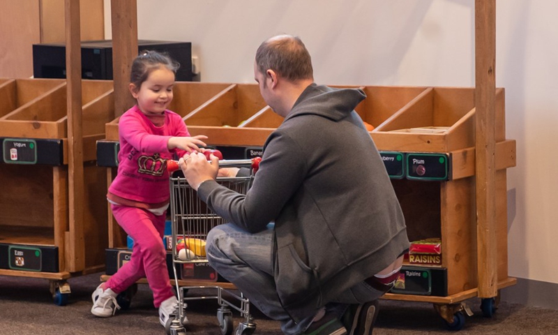 A girl plays games with her father during a simulated shopping at an early start discovery space in Wollongong, Australia, Sept. 26, 2020. (Photo by Hongye Zhu/Xinhua)