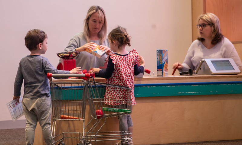 Kids conduct a simulated shopping at an early start discovery space in Wollongong, Australia, Sept. 26, 2020. (Photo by Hongye Zhu/Xinhua)