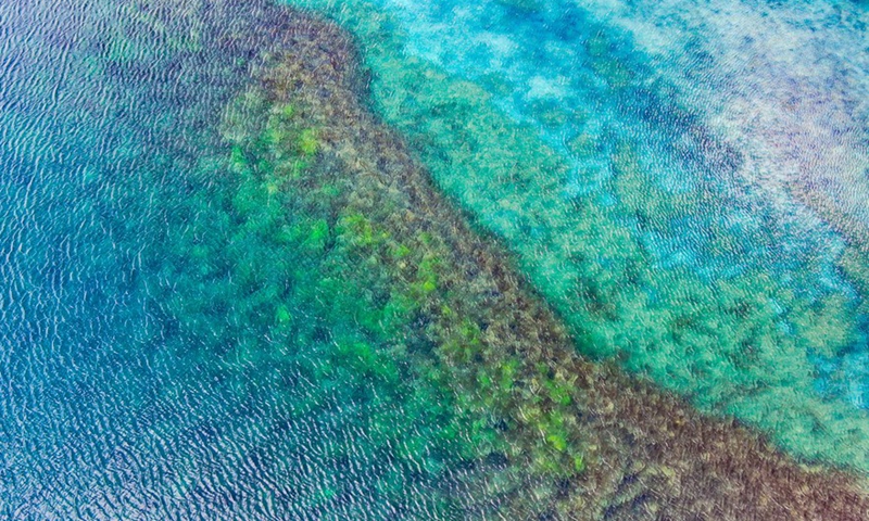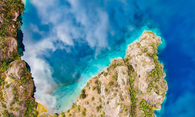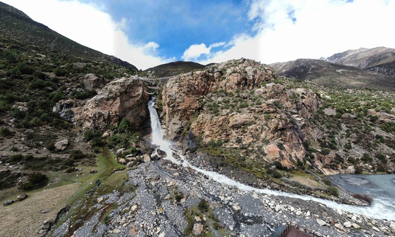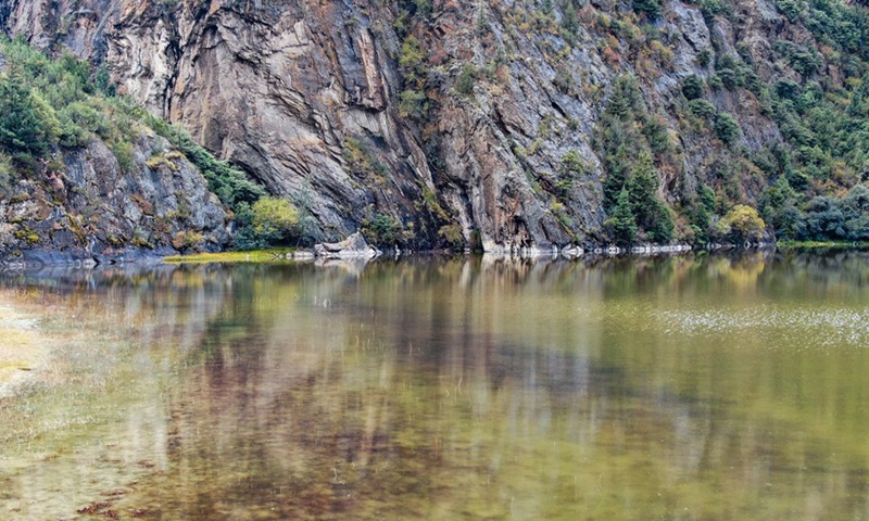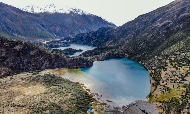 Photo taken with a drone shows the "white lake" of the "three-colored lakes" in Puyu Village of Banbar County, Qamdo, southwest China's Tibet Autonomous Region, Sept. 26, 2020. (Xinhua/Jigme Dorje)