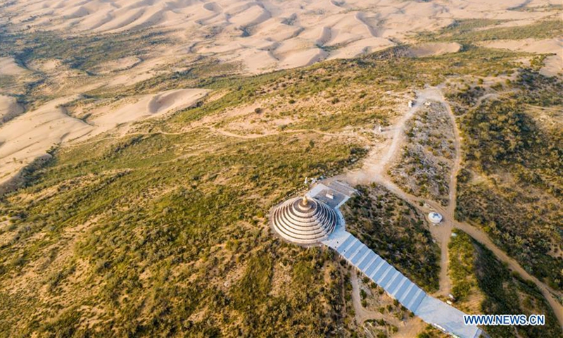 Photo taken on Sept. 14, 2020 shows a photovoltaic power base in Kubuqi Desert in Ordos of north China's Inner Mongolia Autonomous Region. Kubuqi Desert, located in the Ordos plateau, has an area of about 18,600 square kilometers. Once being totally barren and was called the "sea of death", the desert, however, now has a green area of more than 3,200 square kilometers thanks to the efforts of local people, enterprises and government. In 2014, The United Nations Environment Program (UNEP) announced that Kubuqi Desert is an ecological economy demonstration zone, showing the experience and wisdom of Chinese people in the action. (Xinhua/Lian Zhen)