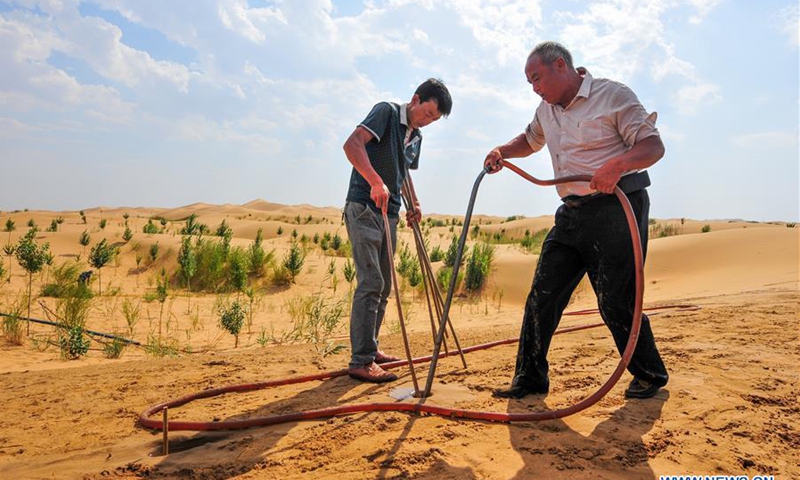 People water the trees in Hanggin Banner of Ordos of north China's Inner Mongolia Autonomous Region, July 27, 2015. Kubuqi Desert, located in the Ordos plateau, has an area of about 18,600 square kilometers. Once being totally barren and was called the "sea of death", the desert, however, now has a green area of more than 3,200 square kilometers thanks to the efforts of local people, enterprises and government. In 2014, The United Nations Environment Program (UNEP) announced that Kubuqi Desert is an ecological economy demonstration zone, showing the experience and wisdom of Chinese people in the action. (Xinhua/Lian Zhen)