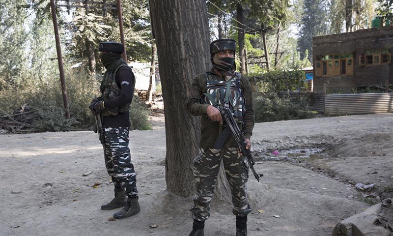 Indian paramilitary troopers stand guard near the site of a gunfight at village Samboora of Pulwama district, about 15 km south of Srinagar city, the summer capital of Indian-controlled Kashmir, Sept. 28, 2020. Two militants were killed in an ongoing fierce gunfight in restive Indian-controlled Kashmir, police said Monday. (Xinhua/Javed Dar)