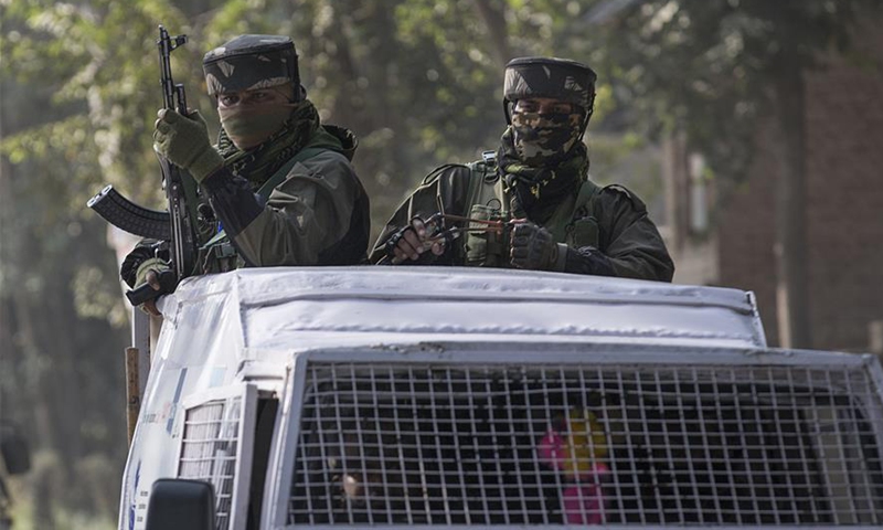 Indian paramilitary troopers stand guard on top of an armored vehicle near the site of a gunfight at village Samboora of Pulwama district, about 15 km south of Srinagar city, the summer capital of Indian-controlled Kashmir, Sept. 28, 2020. Two militants were killed in an ongoing fierce gunfight in restive Indian-controlled Kashmir, police said Monday. (Xinhua/Javed Dar)