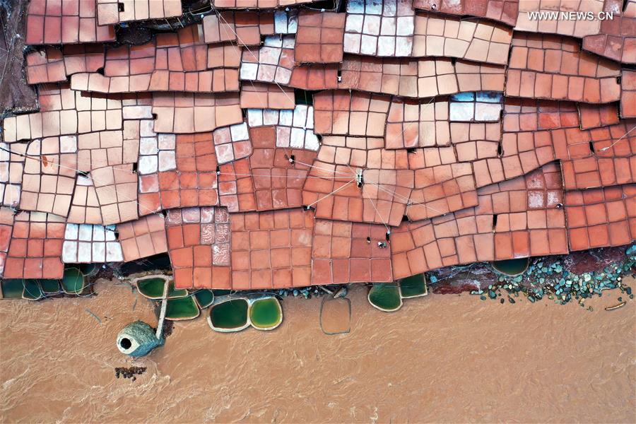 Aerial photo taken on Sept. 28, 2020 shows salt pans in Naxi Township of Mangkam County, Qamdo, southwest China's Tibet Autonomous Region. Local people follow a traditional salt harvesting method by collecting brines from salt mines and ponds and evaporating them in the sun until crystallization. (Xinhua/Zhan Yan)