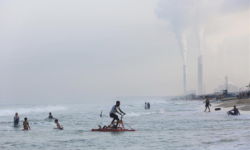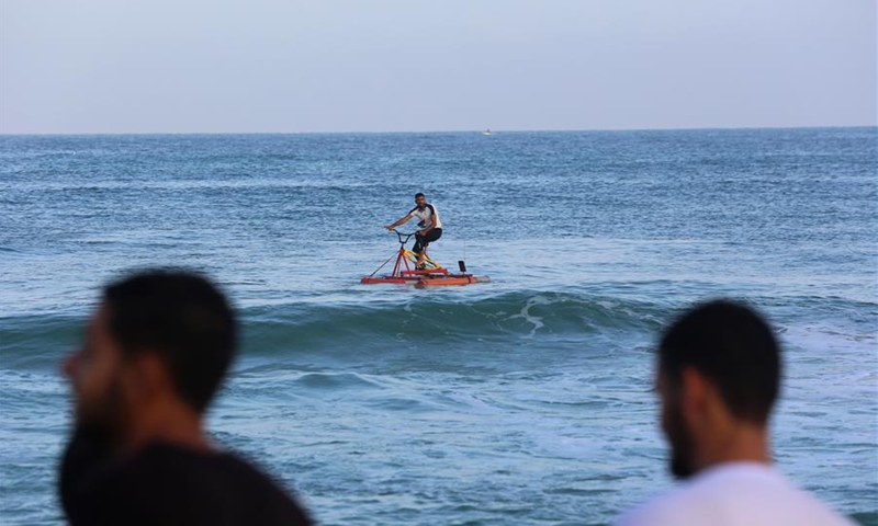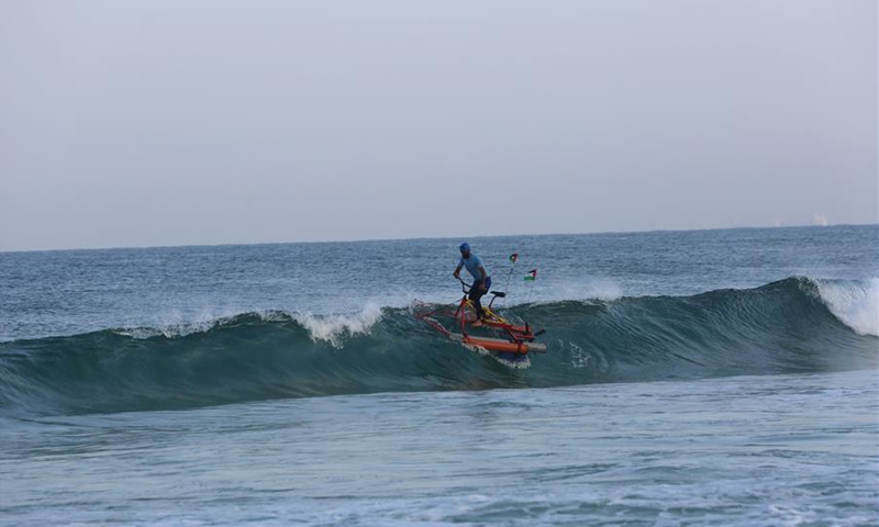 Palestinian fisherman Sary Alrdeea, 21, rides a pedal boat near the coast of the northern Gaza Strip town of Beit Lahia, Sept. 29, 2020. Sary and his older brother Mohammed have made a custom-built pedal boat from recycled materials. (Photo by Rizek Abdeljawad/Xinhua)