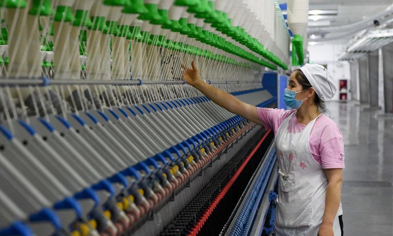 An employee works at a textile factory in Yuli County of Bayan Gol Mongolian Autonomous Prefecture, northwest China's Xinjiang Uygur Autonomous Region, Aug. 24, 2020. Northwest China's Xinjiang Uygur Autonomous Region created some 2 million new jobs for its residents from 2014-19. Since the 18th National Congress of the Communist Party of China (CPC) in 2012, Xinjiang has been vigorously implementing employment projects and enhanced vocational training, and has been expanding employment channels and capacity. From 2014-19, the total number of people employed in Xinjiang rose from 11.35 million to 13.3 million, according to a white paper on employment and labor rights in Xinjiang published by the State Council Information Office recently. More and more rural laborers are being employed in cities after skill training. The average annual increase in urban employment is more than 471,200 people, with 148,000 in southern Xinjiang, accounting for 31.4 percent. Photo:Xinhua