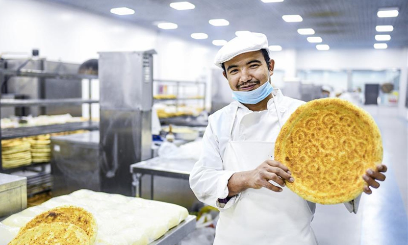 Abdu Salam, a worker from Yengisar County, Kashgar, displays a piece of nang, a kind of flatbread, at a flatbread industrial park in Urumqi, northwest China's Xinjiang Uygur Autonomous Region, Jan. 10, 2019. Northwest China's Xinjiang Uygur Autonomous Region created some 2 million new jobs for its residents from 2014-19. Since the 18th National Congress of the Communist Party of China (CPC) in 2012, Xinjiang has been vigorously implementing employment projects and enhanced vocational training, and has been expanding employment channels and capacity. From 2014-19, the total number of people employed in Xinjiang rose from 11.35 million to 13.3 million, according to a white paper on employment and labor rights in Xinjiang published by the State Council Information Office recently. More and more rural laborers are being employed in cities after skill training. The average annual increase in urban employment is more than 471,200 people, with 148,000 in southern Xinjiang, accounting for 31.4 percent.Photo:Xinhua