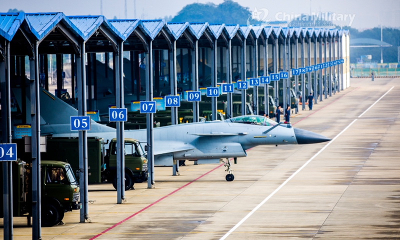 J-10 fighter jets attached to an aviation brigade of the air force under the PLA Southern Theater Command taxi out of aircraft hangars successively onto the flightline during a real-combat flight training exercise in mid September, 2020. Photo:China Military