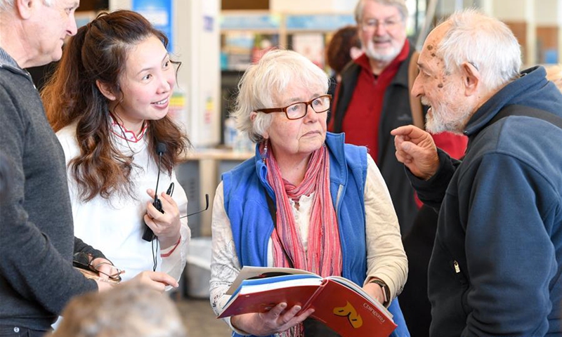 Local people talk with Zhang Lan, a teacher from China Cultural Centre in Wellington, during a medley of traditional Chinese cultural activities held in Lower Hutt library, Wellington, New Zealand, Sept. 30, 2020, to celebrate the Mid-Autumn Festival, which falls on Oct. 1 this year. (Xinhua/Guo Lei)