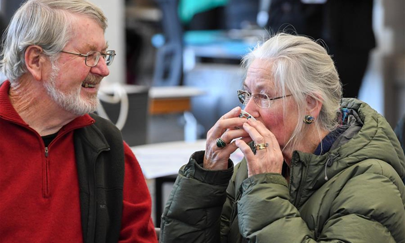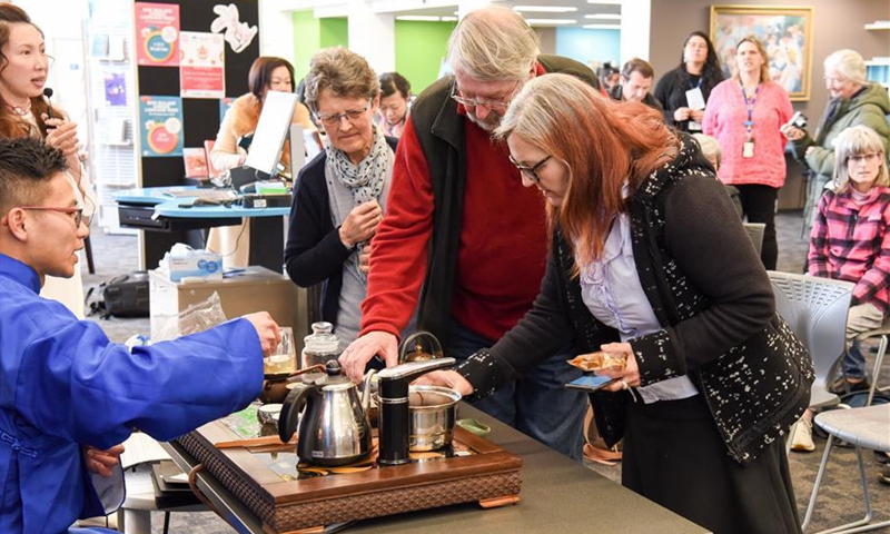 Local people taste tea during a medley of traditional Chinese cultural activities held in Lower Hutt library, Wellington, New Zealand, Sept. 30, 2020, to celebrate the Mid-Autumn Festival, which falls on Oct. 1 this year. (Xinhua/Guo Lei)