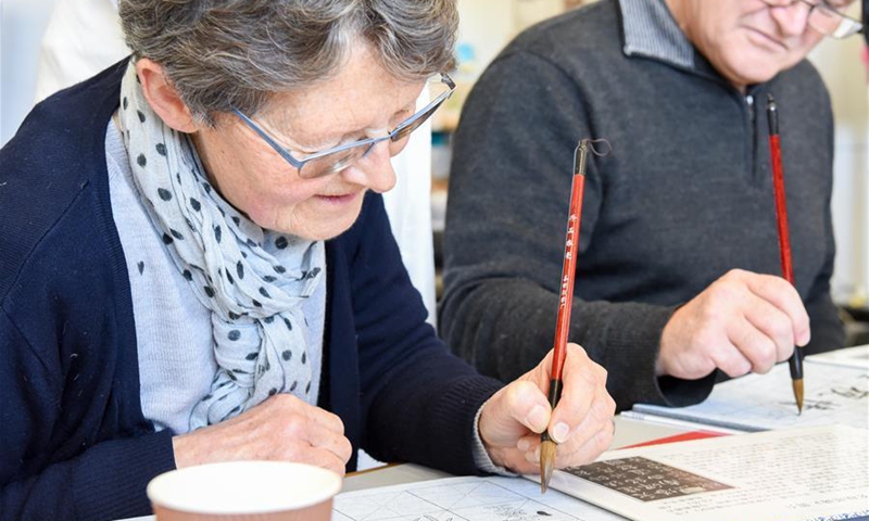 Local people experience calligraphy during a medley of traditional Chinese cultural activities held in Lower Hutt library, Wellington, New Zealand, Sept. 30, 2020, to celebrate the Mid-Autumn Festival, which falls on Oct. 1 this year. (Xinhua/Guo Lei)