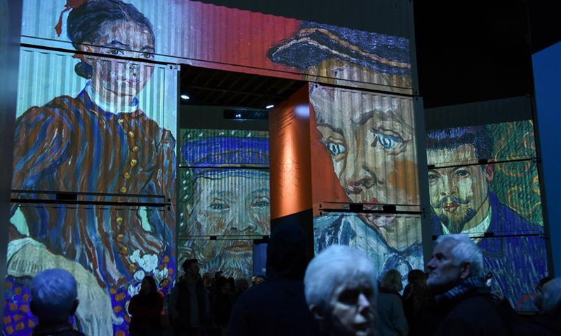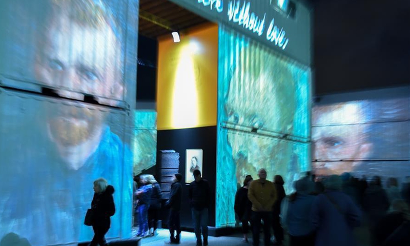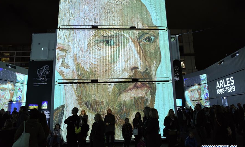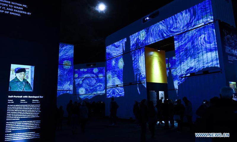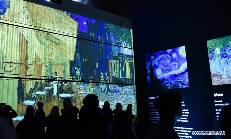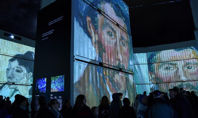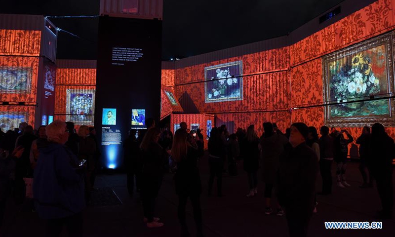 People visit the outdoor immersive exhibition "Digital Nights Wellington -- Van Gogh Alive" in Wellington, New Zealand, Oct. 1, 2020. The musical and visual exhibition held at the waterfront of Wellington brings visitors closer to Dutch painter Van Gogh's works with vibrant colors and vivid details. (Xinhua/Guo Lei)